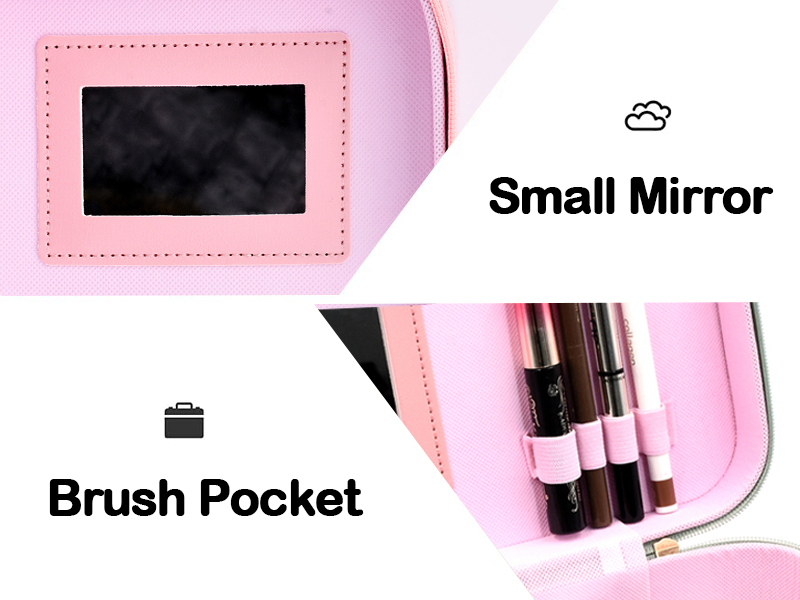 - This bag has multiple compartments, pockets and elastic loops of various sizes for easy access. It can store your lipstick, eye shadow palette, eyebrow pencil and other cosmetics of different sizes. We have flat opening designs and diagonal zipper opening designs for you to choose from, which solves the problem of finding items in messy bags.
